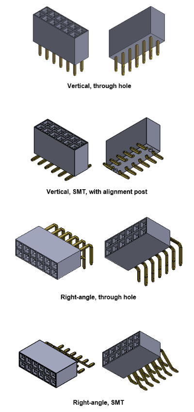 EDAC E-Socket母座与E-Pin公座配合,提供可靠且经济的板对板连接。有多种间距和pin数,单排、两排或三排配置。端子尾针类型包括180度和90度通孔和SMT。端子通常可以提供镀锡或各种镀金厚度。可提供定制的配合高度、特殊弯头尺寸等。